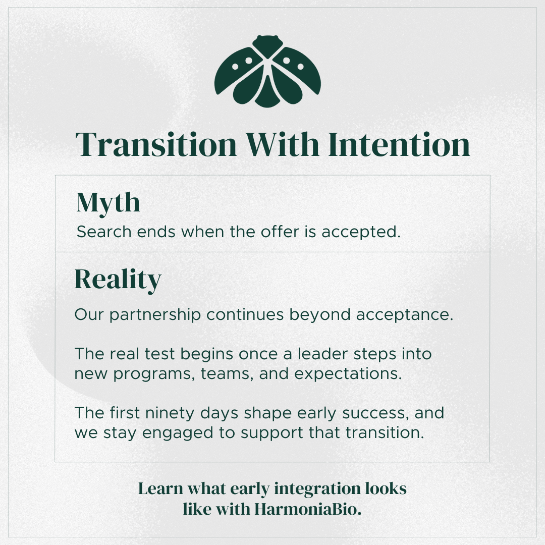 At HarmoniaBio, we stay engaged beyond acceptance to support leaders as they navigate new programs, teams, and expectations. Because successful integration is where long term impact begins.